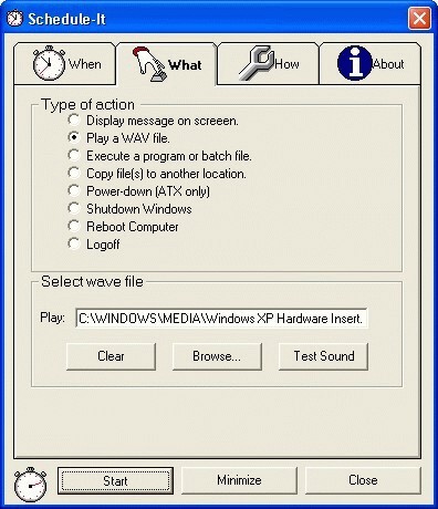 your computer. Events such as, display a message, play a WAVe file, start an application,